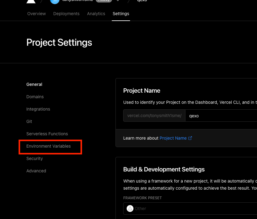到Vercel的项目设置 -> Environment Variables