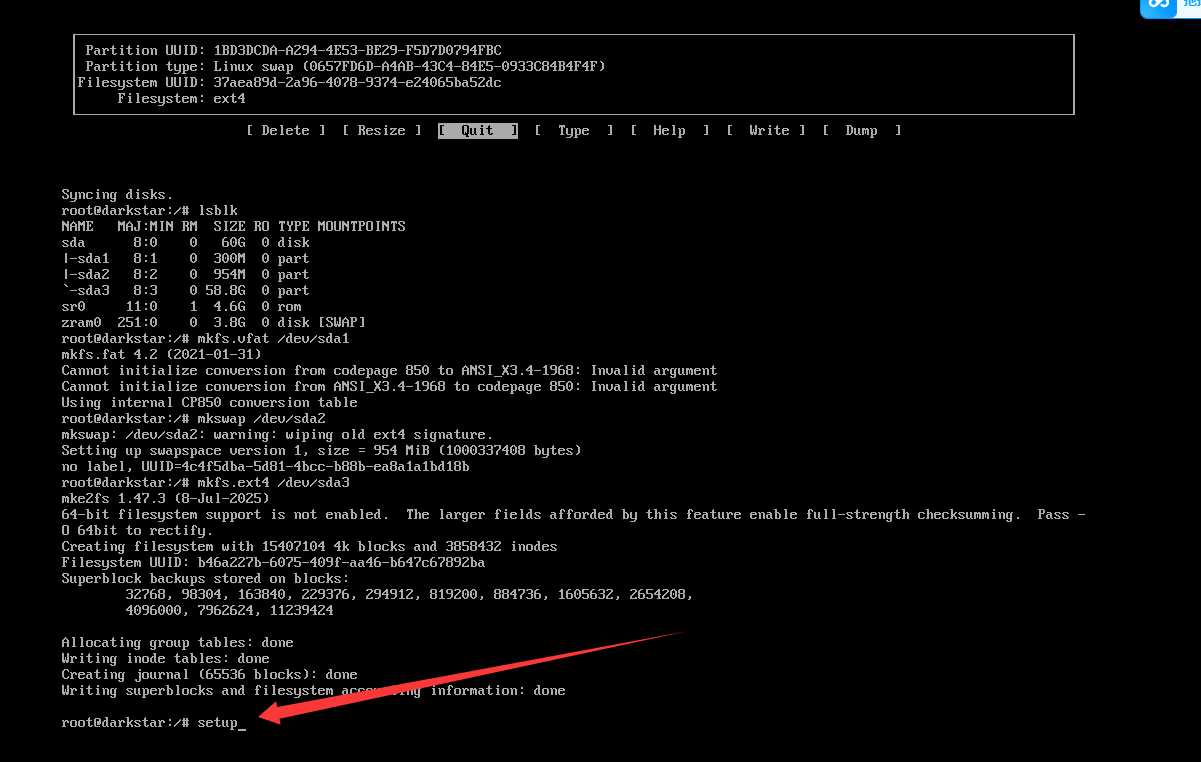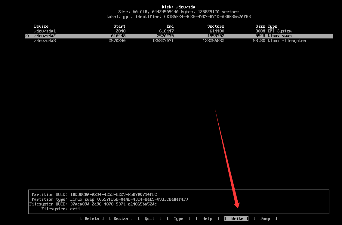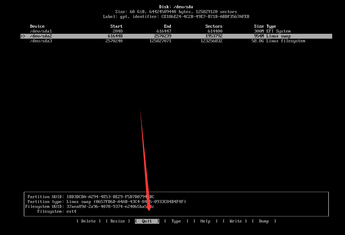 对于很多人来说我推荐使用 cfdisk 进行分区,因为其类图形界面更方便观察硬盘的分区表。