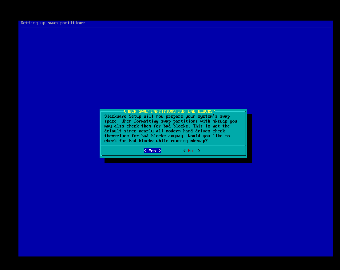 这一步将会开始检查交换分区的坏块,需要一分钟的时间,你也可以选择 “No” 跳过检查