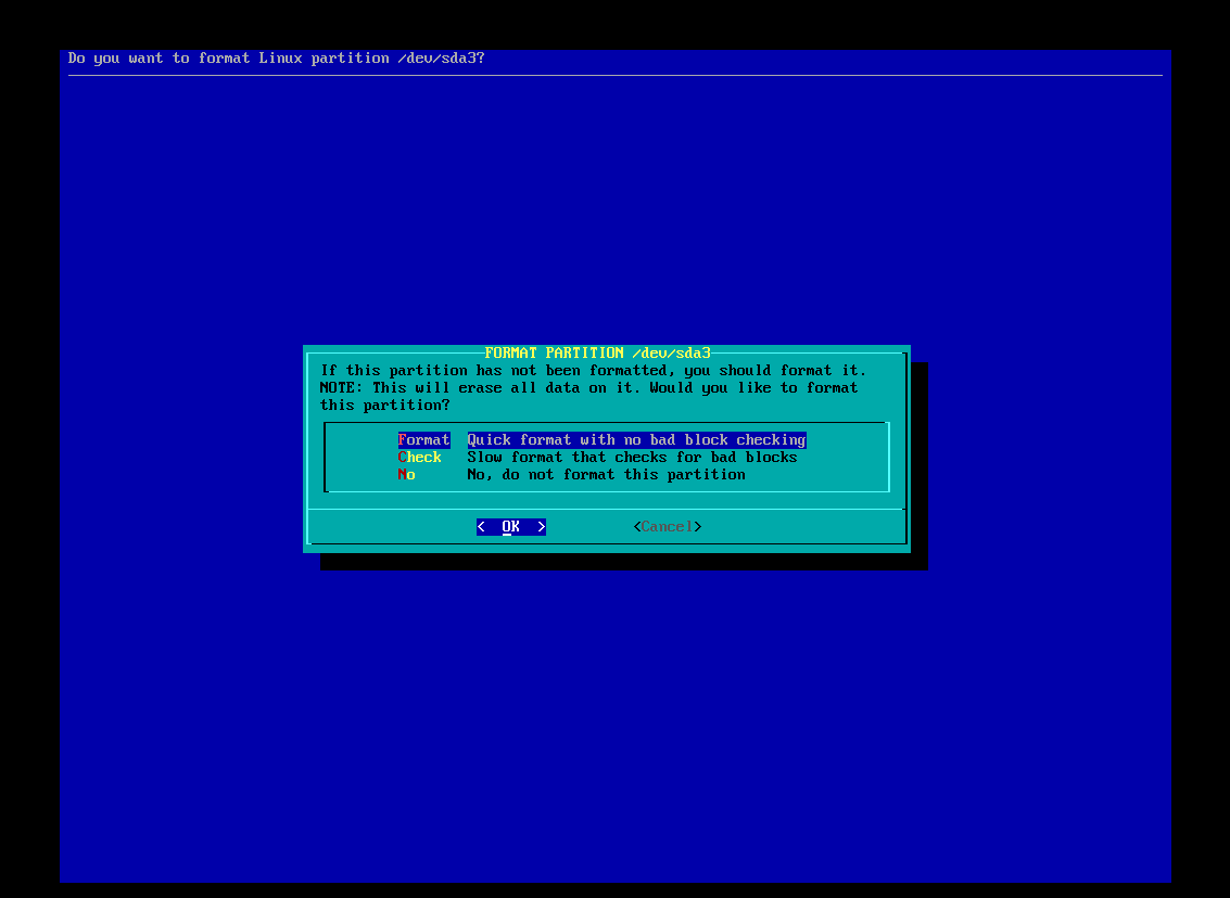 这里他会询问你是否需要格式化该分区,三个选项分别是“快速格式化(不进行坏块检查)”、“格式化(进行坏块检查)”、“不进行格式化”,由于我们刚刚已经进行过格式化分区的步骤,所以我们可以直接选择 “No” 跳过格式化的步骤。