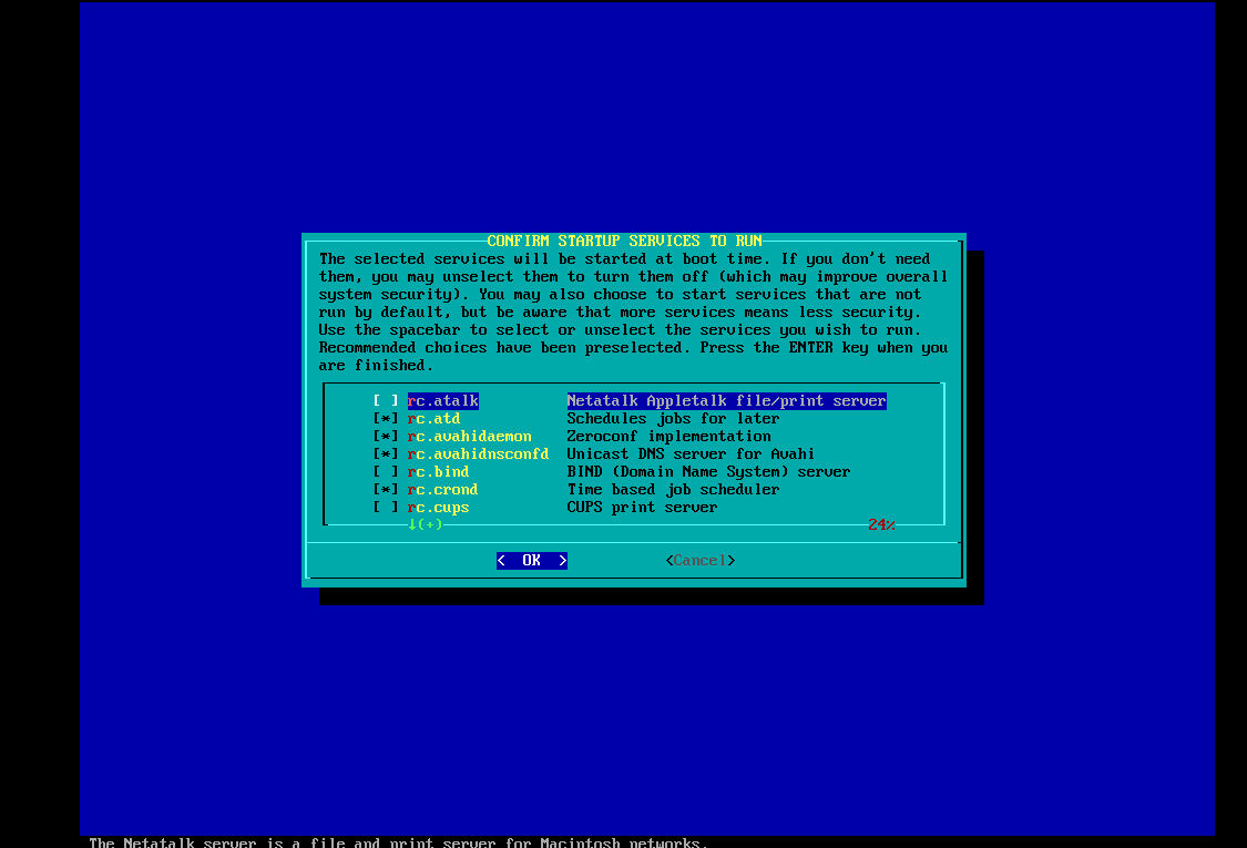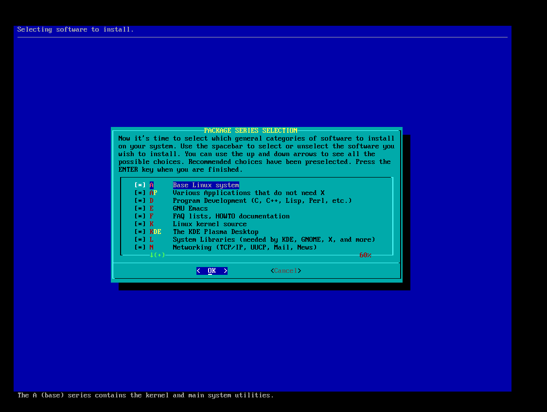 这一步可以自由选择需要安装的包,你可以通过按下空格键取消或勾选你需要或不需要的包以丰富或精简你的系统。