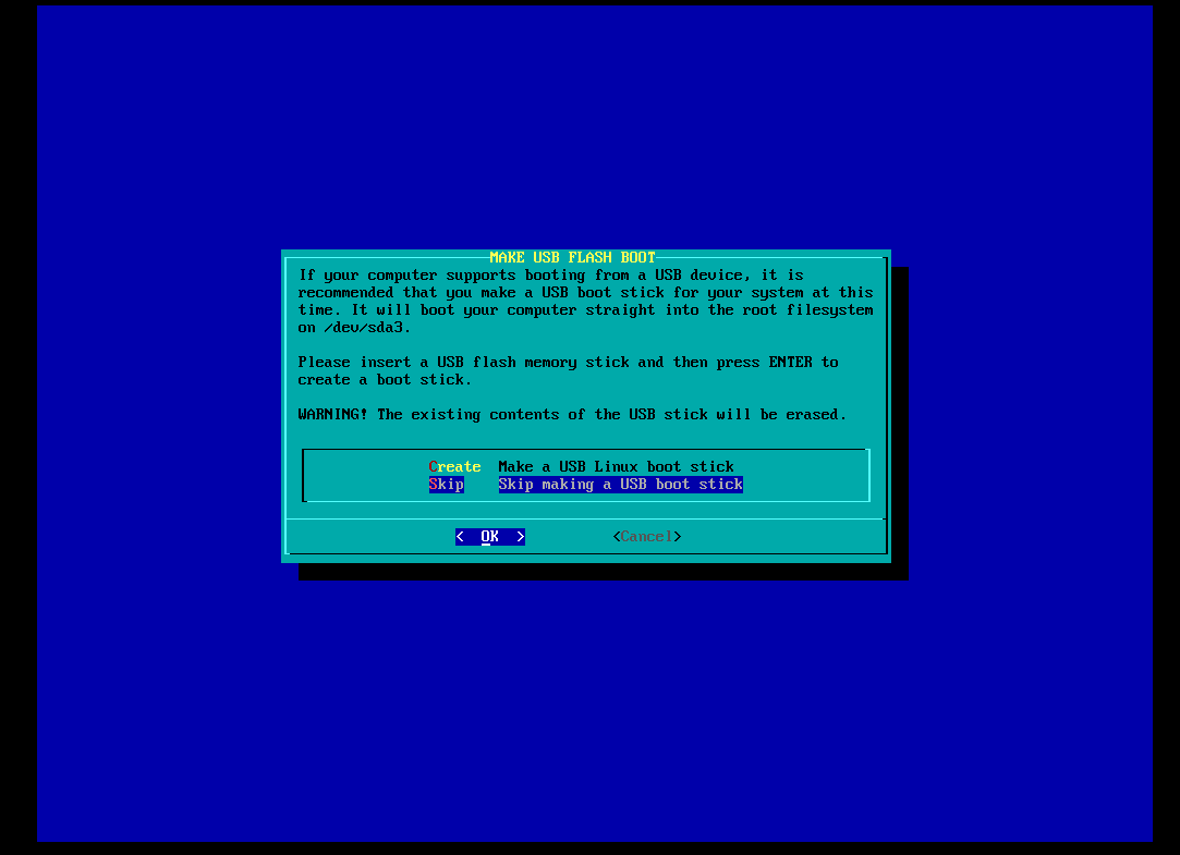 安装完毕后会询问你要不要使用一个U盘作为启动盘(就是通过U盘直接引导进硬盘里的系统),我们这里选择Skip