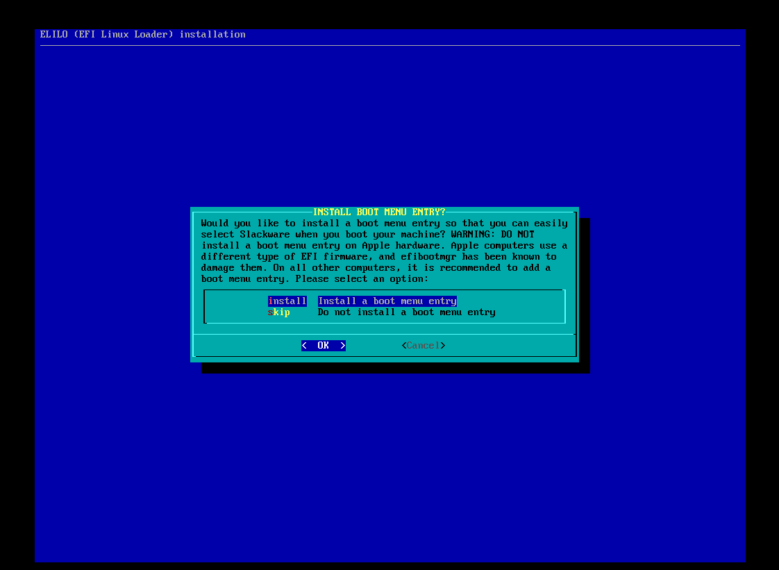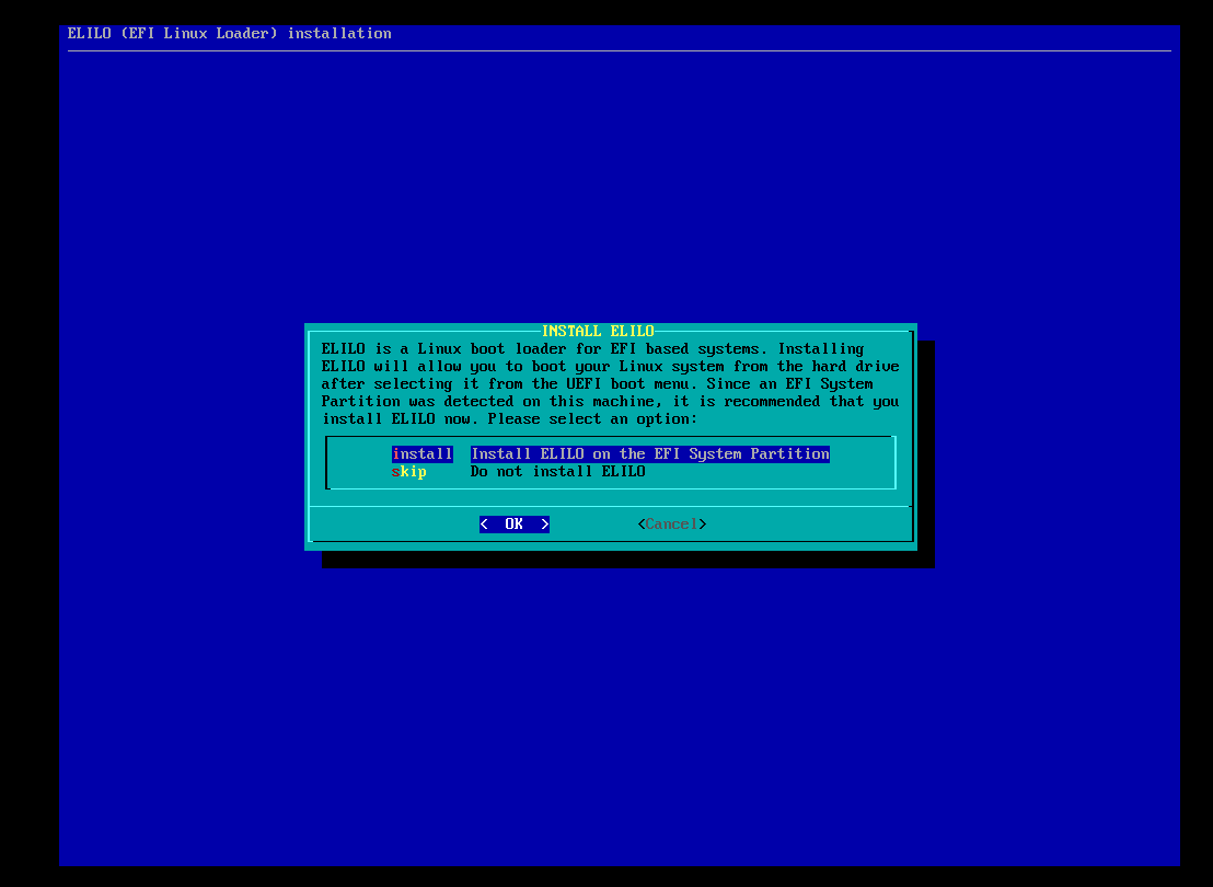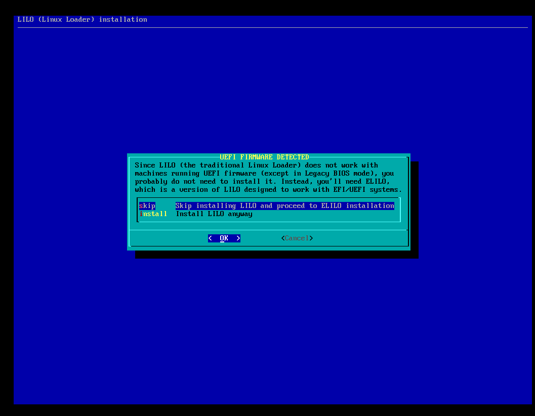 如果你在使用UEFI引导的话,他会告诉你LILO(一种非常远古的Linux的引导启动工具,在GRUB出现之前都是使用这个)已经不能在UEFI环境下使用,会询问你是要跳过LILO的安装并安装ELILO还是仍然安装LILO