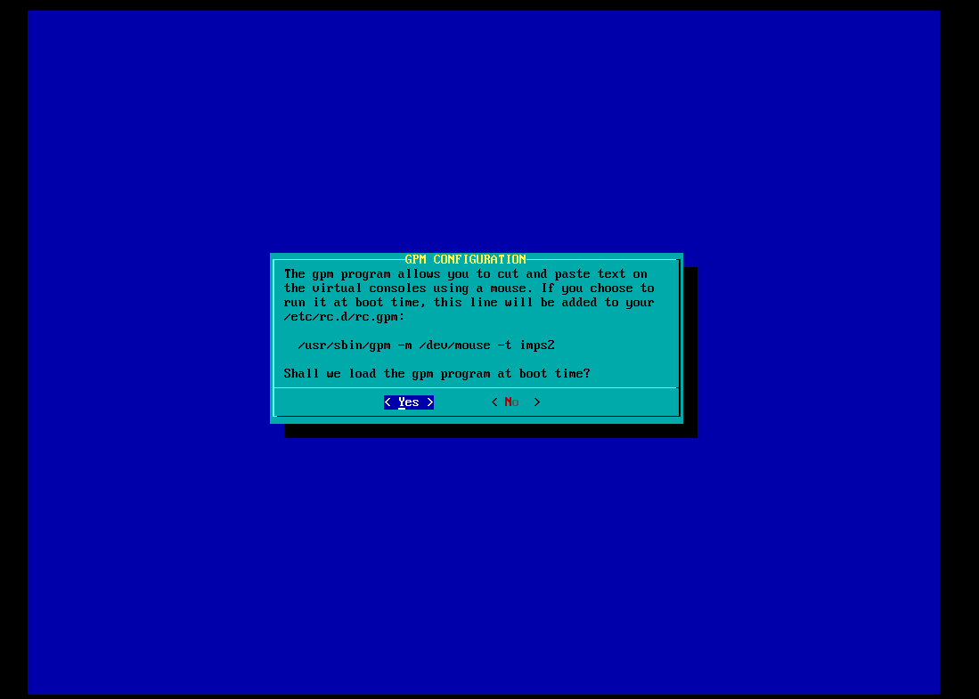 接着会询问你是否安装GPM,GPM的作用是你在纯文本界面的时候仍然可以使用鼠标进行选择文本的操作