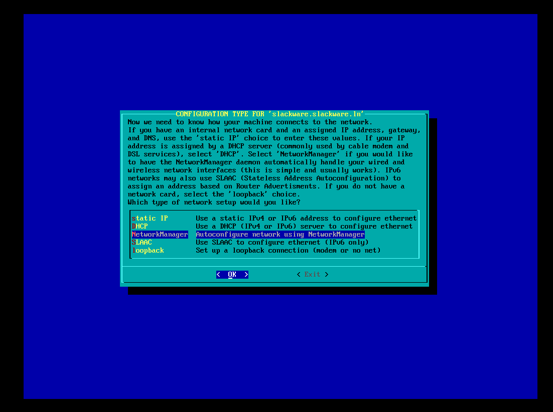 不知道出于什么原因,即使 Slackware Linux 已经提供了一键网络配置向导(一开始安装系统的时候也运行了)netconfig,但是你选择 NetworkManager 的话它是不会给你默认在 init 里设置好让它启动服务的,并且官方文档(Network Setup)中对此没有过多的解释,你需要进一步的设置才能开启。