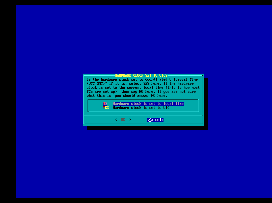 这里他会询问你的BIOS时间是否设置到了协调世界时,一般来说我们只需要保持本地时区的时间设置,选择”No”